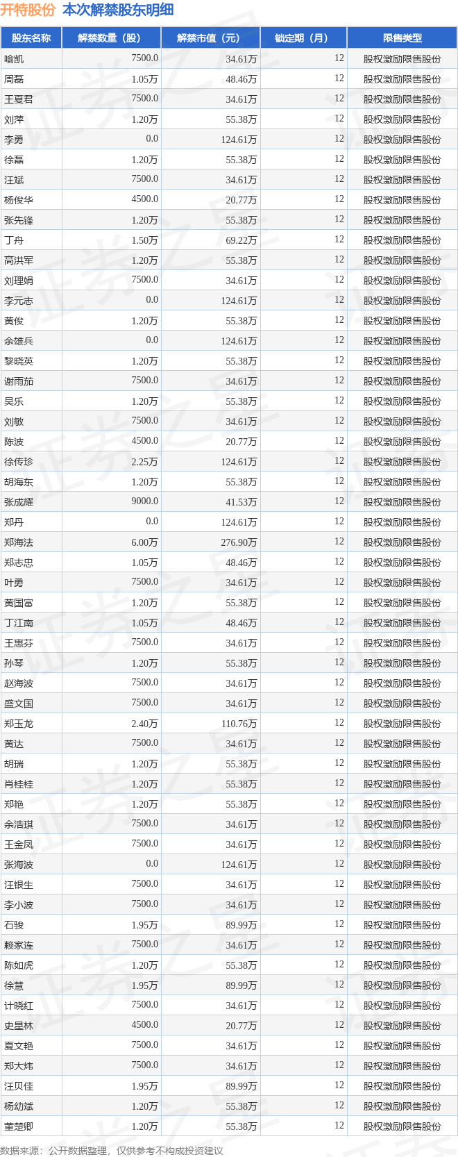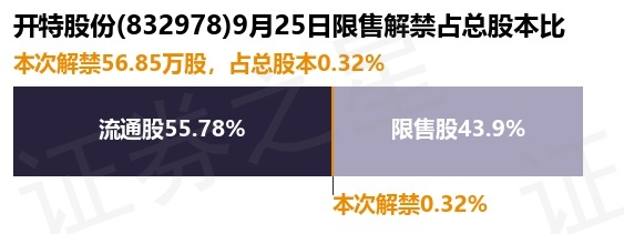 证券之星消息,根据市场公开信息整理,开特股份(832978)于9月25日将有56.85万股限售股份解禁,为公司股权激励限售股份,占公司总股本0.32%。(本次数据根据历史公告整理得出,实际情况以上市公司最新公告为准)最近一年内,该股累计解禁1051.8万股,占总股本的5.85%。本次解禁后,公司还有7891.35万股限售股份,占总股本43.9%。具体如下图所示: