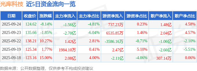 证券之星消息,截至2025年9月24日收盘,光库科技(300620)报收于124.62元,下跌8.14%,换手率10.53%,成交量26.02万手,成交额32.36亿元。