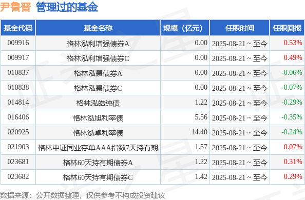 尹鲁晋先生:中国国籍,厦门大学王亚南经济研究院金融学博士。曾任山西晋城无烟煤矿业集团有限责任公司财务总部主办会计、渤海证券固定收益总部及债券融资总部高级副总裁、金圆统一证券投资银行部业务总监。2021年7月加入格林基金,曾任研究部信评总监、特定客户资产管理部投资经理,现任基金经理。2025年8月21日担任格林泓景债券型证券投资基金、格林中证同业存单AAA指数7天持有期证券投资基金、格林60天持有期债券型证券投资基金、格林泓旭利率债债券型证券投资基金、格林泓利增强债券型证券投资基金基金经理、格林泓皓纯债债券型证券投资基金基金经理。