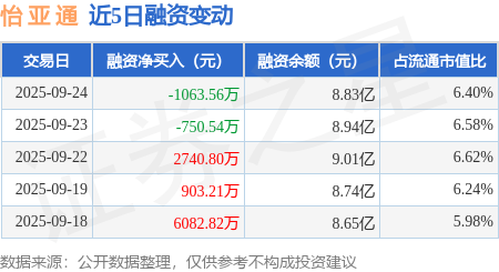 证券之星消息,9月24日,怡 亚 通(002183)融资买入7640.8万元,融资偿还8704.36万元,融资净卖出1063.56万元,融资余额8.83亿元,近20个交易日中有13个交易日出现融资净买入。