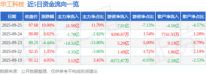 9月25日的资金流向数据方面,主力资金净流入11.5亿元,占总成交额11.7%,游资资金净流出7.01亿元,占总成交额7.13%,散户资金净流出4.5亿元,占总成交额4.57%。