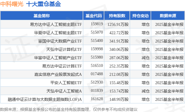 根据2025基金半年报公募基金重仓股数据,重仓该股的公募基金共84家,其中持有数量最多的公募基金为易方达基金的易方达中证人工智能主题ETF。易方达中证人工智能主题ETF目前规模为165.78亿元,最新净值1.5257(9月24日),较上一交易日上涨1.86%,近一年上涨133.75%。该公募基金现任基金经理为张湛。张湛在任的基金产品包括:易方达中证科技50ETF,管理时间为2020年3月16日至今,期间收益率为43.18%;易方达中证万得生物科技指数(LOF)C,管理时间为2020年12月3日至今,期间收益率为-34.33%;易方达中证生物科技主题ETF,管理时间为2021年1月14日至今,期间收益率为-44.29%。
