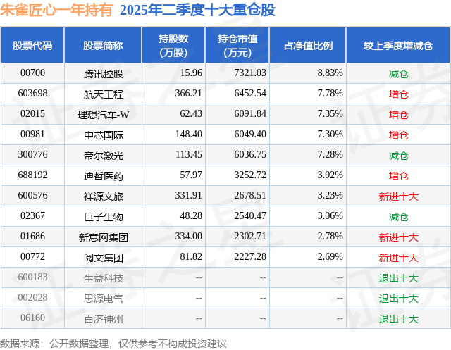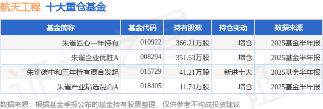 根据2025基金半年报公募基金重仓股数据,重仓该股的公募基金共4家,其中持有数量最多的公募基金为朱雀基金的朱雀匠心一年持有。朱雀匠心一年持有目前规模为8.29亿元,最新净值0.9147(9月24日),较上一交易日上涨1.81%,近一年上涨48.51%。该公募基金现任基金经理为陈飞。陈飞在任的基金产品包括:朱雀企业优胜A,管理时间为2023年8月9日至今,期间收益率为17.18%;朱雀产业精选混合A,管理时间为2025年5月26日至今,期间收益率为17.96%;朱雀企业优选A,管理时间为2025年9月11日至今,期间收益率为1.69%。