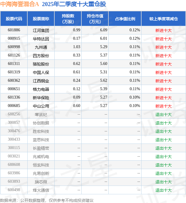 中海海誉混合A的前十大重仓股如下: