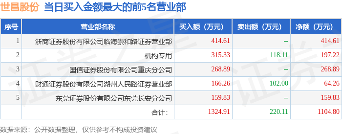 从龙虎榜公布的当日买卖数据来看,机构合计净买入197.22万元。流沙河等知名游资榜上有名。(知名游资流沙河一般指中国银河证券股份有限公司绍兴证券营业部席位,根据市场资料整理,仅供参考)