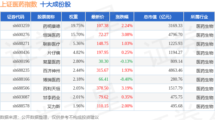 证券之星消息,9月25日,上证医药(000037)指数报收于7316.34点,涨0.89%,成交295.29亿元,换手率1.1%。当日该指数成份股中,上涨的有17家,百利天恒以3.19%的涨幅领涨,下跌的有32家,博瑞医药以8.4%的跌幅领跌。