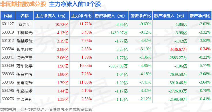 资金流向方面,非周期(000064)指数成份股当日主力资金净流出合计28.8亿元,游资资金净流入合计6.02亿元,散户资金净流入合计22.78亿元。成份股资金流向详情见下表: