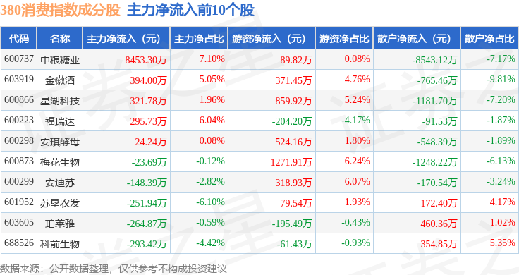 资金流向方面,380消费(000108)指数成份股当日主力资金净流出合计9210.71万元,游资资金净流入合计8787.36万元,散户资金净流入合计423.36万元。成份股资金流向详情见下表:
