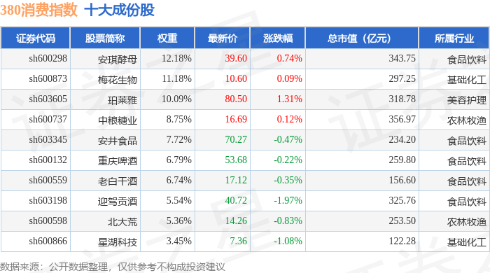 证券之星消息,9月25日,380消费(000108)指数报收于12258.04点,跌0.13%,成交38.89亿元,换手率0.96%。当日该指数成份股中,上涨的有6家,珀莱雅以1.31%的涨幅领涨,下跌的有14家,迎驾贡酒以1.97%的跌幅领跌。