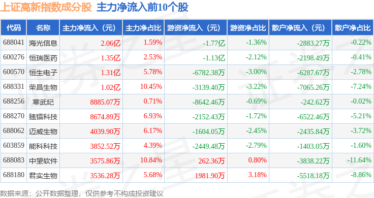 资金流向方面,上证高新(000131)指数成份股当日主力资金净流出合计3.98亿元,游资资金净流入合计1101.64万元,散户资金净流入合计3.87亿元。成份股资金流向详情见下表:
