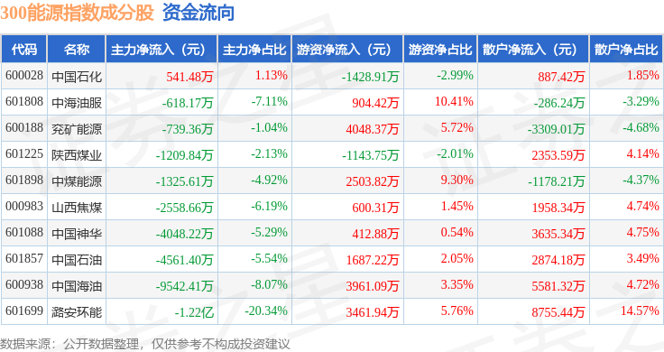 资金流向方面,300能源(000908)指数成份股当日主力资金净流出合计3.63亿元,游资资金净流入合计1.5亿元,散户资金净流入合计2.13亿元。成份股资金流向详情见下表: