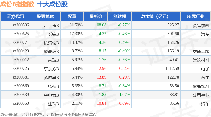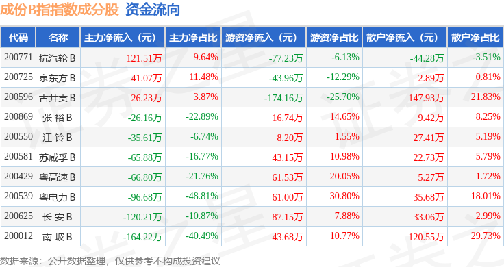 资金流向方面,成份B指(399003)指数成份股当日主力资金净流出合计386.74万元,游资资金净流入合计26.09万元,散户资金净流入合计360.65万元。成份股资金流向详情见下表:
