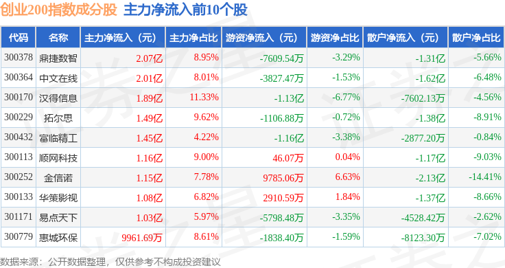 资金流向方面,创业200(399019)指数成份股当日主力资金净流出合计25.09亿元,游资资金净流入合计7.6亿元,散户资金净流入合计17.49亿元。成份股资金流向详情见下表: