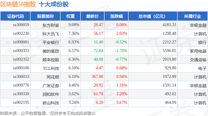证券之星消息,9月25日,区块链50(399286)指数报收于4265.57点,涨0.64%,成交729.62亿元,换手率3.45%。当日该指数成份股中,上涨的有33家,顺网科技以5.95%的涨幅领涨,下跌的有16家,东华软件以3.24%的跌幅领跌。