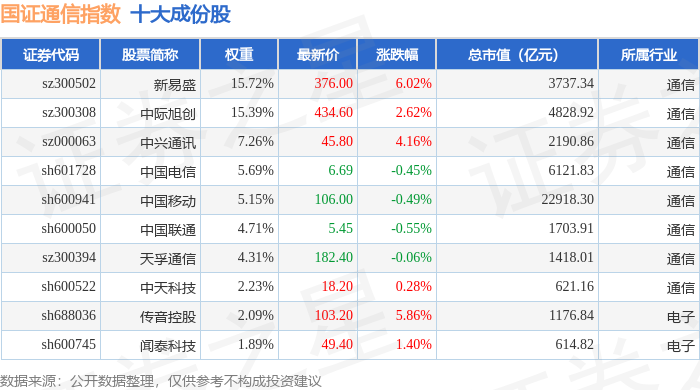 证券之星消息,9月25日,国证通信(399389)指数报收于7451.23点,涨2.11%,成交1323.15亿元,换手率1.8%。当日该指数成份股中,上涨的有35家,神宇股份以12.52%的涨幅领涨,下跌的有35家,普天科技以2.58%的跌幅领跌。