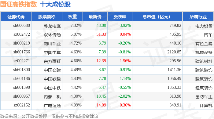 证券之星消息,9月25日,国证高铁(399419)指数报收于2184.68点,跌1.17%,成交245.86亿元,换手率0.84%。当日该指数成份股中,上涨的有11家,海达股份以1.86%的涨幅领涨,下跌的有39家,佳讯飞鸿以5.33%的跌幅领跌。