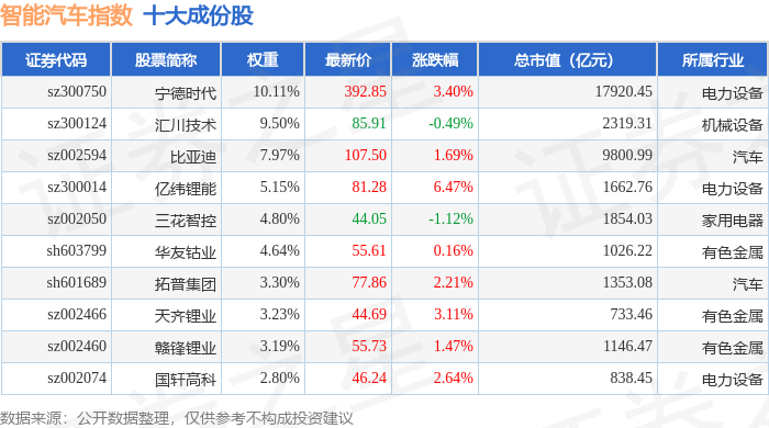 智能汽车(399432)指数十大成份股详情如下:
