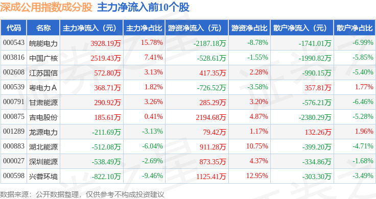 资金流向方面,深成公用(399689)指数成份股当日主力资金净流出合计1.74亿元,游资资金净流入合计4009.16万元,散户资金净流入合计1.34亿元。成份股资金流向详情见下表: