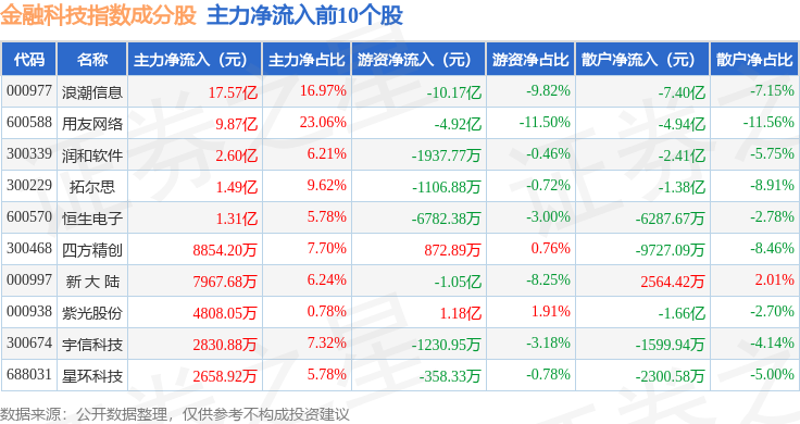 资金流向方面,金融科技(399699)指数成份股当日主力资金净流入合计14.34亿元,游资资金净流出合计13.73亿元,散户资金净流出合计6083.92万元。成份股资金流向详情见下表: