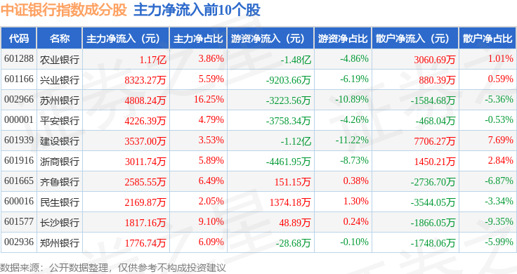 资金流向方面,中证银行(399986)指数成份股当日主力资金净流出合计2.96亿元,游资资金净流出合计4.4亿元,散户资金净流入合计7.36亿元。成份股资金流向详情见下表: