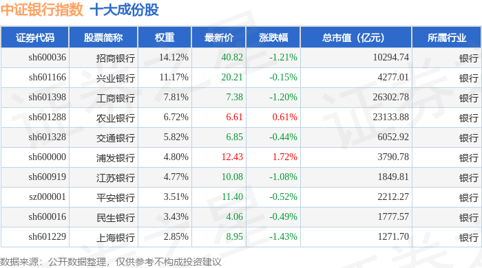 证券之星消息,9月25日,中证银行(399986)指数报收于7303.68点,跌0.66%,成交284.03亿元,换手率0.29%。当日该指数成份股中,上涨的有2家,浦发银行以1.72%的涨幅领涨,下跌的有40家,渝农商行以3.52%的跌幅领跌。
