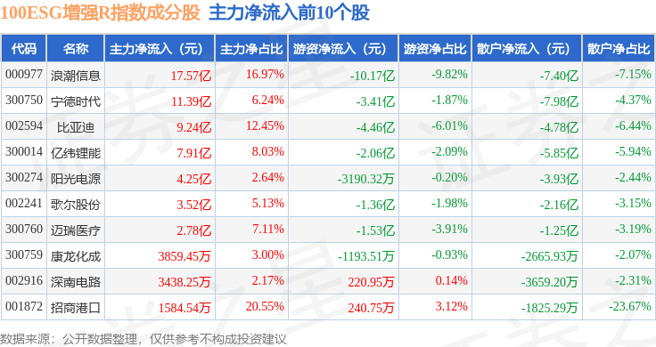 资金流向方面,100ESG增强R(470033)指数成份股当日主力资金净流入合计13.75亿元,游资资金净流出合计12.93亿元,散户资金净流出合计8221.32万元。成份股资金流向详情见下表: