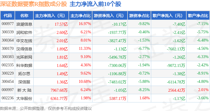 资金流向方面,深证数据要素R(470053)指数成份股当日主力资金净流入合计22.92亿元,游资资金净流出合计11.41亿元,散户资金净流出合计11.5亿元。成份股资金流向详情见下表: