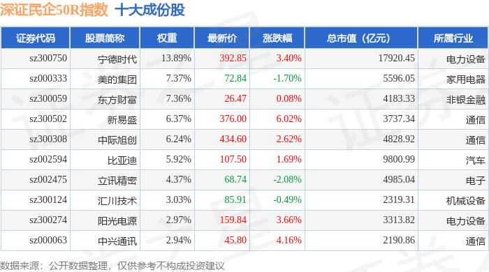 证券之星消息,9月25日,深证民企50R(470057)指数报收于3981.35点,涨1.35%,成交2301.85亿元,换手率3.04%。当日该指数成份股中,上涨的有28家,亿纬锂能以6.47%的涨幅领涨,下跌的有22家,万丰奥威以3.35%的跌幅领跌。