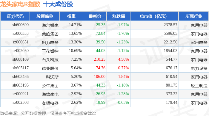 龙头家电R(480028)指数十大成份股详情如下: