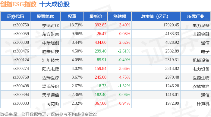 创指ESG(970028)指数十大成份股详情如下:
