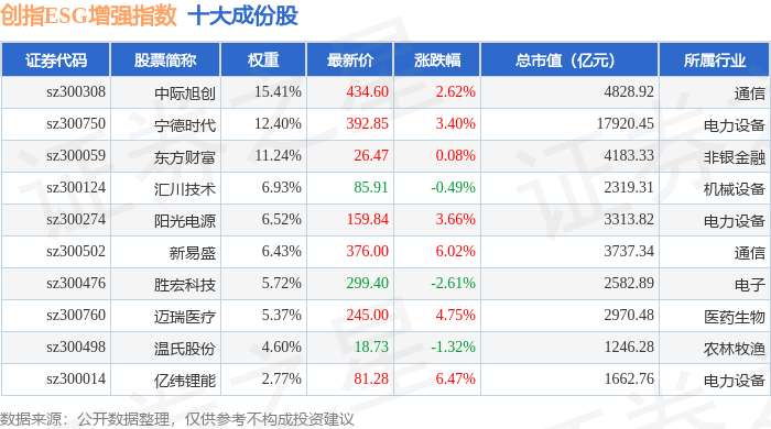 证券之星消息,9月25日,创指ESG增强(970034)指数报收于2966.7点,涨1.75%,成交1670.18亿元,换手率2.66%。当日该指数成份股中,上涨的有21家,亿纬锂能以6.47%的涨幅领涨,下跌的有19家,胜宏科技以2.61%的跌幅领跌。