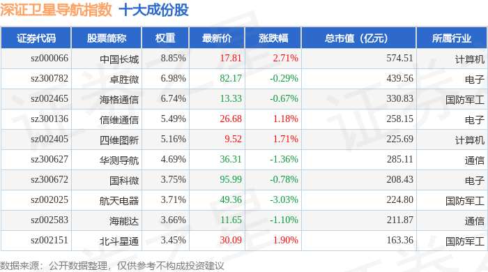 证券之星消息,9月25日,深证卫星导航(970050)指数报收于3290.43点,跌0.51%,成交195.32亿元,换手率3.89%。当日该指数成份股中,上涨的有9家,中国长城以2.71%的涨幅领涨,下跌的有32家,四川九洲以3.71%的跌幅领跌。