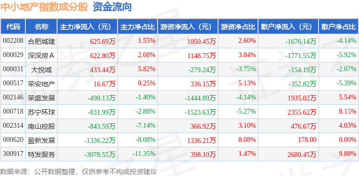 资金流向方面,中小地产(971002)指数成份股当日主力资金净流出合计4881.89万元,游资资金净流入合计1388.81万元,散户资金净流入合计3493.08万元。成份股资金流向详情见下表:
