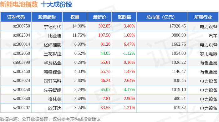 新能电池(980032)指数十大成份股详情如下: