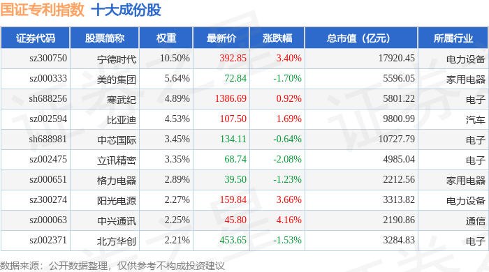 证券之星消息,9月25日,国证专利(980070)指数报收于3764.73点,涨1.13%,成交2857.41亿元,换手率1.71%。当日该指数成份股中,上涨的有52家,上海电气以10.03%的涨幅领涨,下跌的有47家,上汽集团以2.83%的跌幅领跌。
