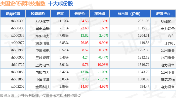 央国企低碳科技(980082)指数十大成份股详情如下: