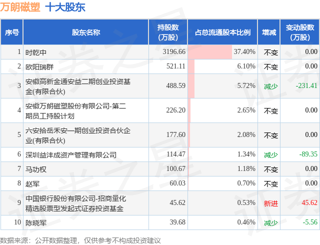 根据万朗磁塑2025年中报公布的十大股东详情如下: