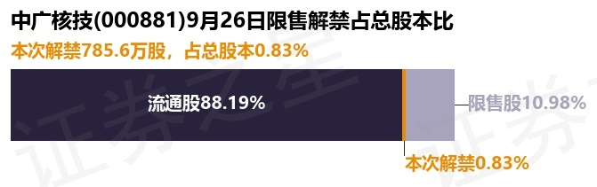 证券之星消息,根据市场公开信息整理,中广核技(000881)于9月26日将有785.6万股限售股份解禁,为公司定向增发机构配售股份,占公司总股本0.83%。(本次数据根据历史公告整理得出,实际情况以上市公司最新公告为准)最近一年内,该股累计解禁4339.31万股,占总股本的4.59%。本次解禁后,公司还有1.04亿股限售股份,占总股本10.98%。具体如下图所示: