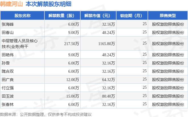 证券之星消息,根据市场公开信息整理,韩建河山(603616)于9月26日将有292.5万股限售股份解禁,为公司股权激励限售股份,占公司总股本0.75%。(本次数据根据历史公告整理得出,实际情况以上市公司最新公告为准)本次解禁后,公司还有702.5万股限售股份,占总股本1.8%。具体如下图所示: