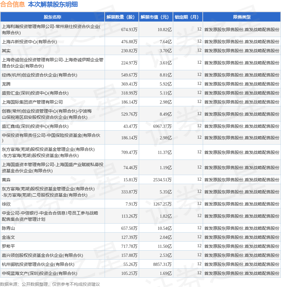 证券之星消息,根据市场公开信息整理,合合信息(688615)于9月26日将有6867.02万股限售股份解禁,为公司首发原股东限售股份,首发战略配售股份,占公司总股本49.05%。(本次数据根据历史公告整理得出,实际情况以上市公司最新公告为准)最近一年内,该股累计解禁120.39万股,占总股本的0.86%。本次解禁后,公司还有4332.98万股限售股份,占总股本30.95%。具体如下图所示: