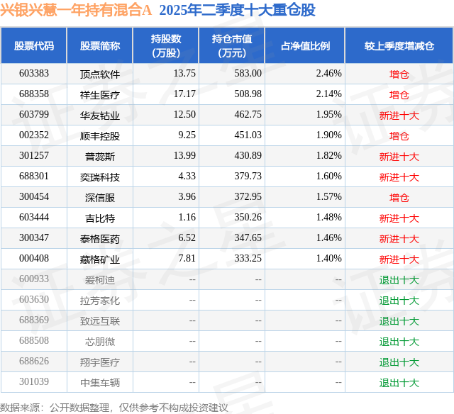 兴银兴慧一年持有混合A的前十大重仓股如下:
