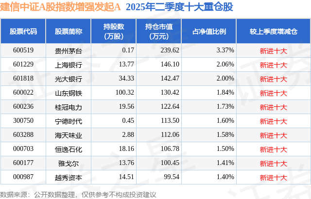 根据2025基金半年报公募基金重仓股数据,重仓该股的公募基金共1家,其中持有数量最多的公募基金为建信基金的建信中证A股指数增强发起A。建信中证A股指数增强发起A目前规模为0.51亿元,最新净值1.268(9月25日),较上一交易日上涨0.28%。该公募基金现任基金经理为叶乐天。叶乐天在任的基金产品包括:建信央视财经50指数(LOF),管理时间为2013年3月28日至今,期间收益率为234.06%;建信中证500指数增强A,管理时间为2014年1月27日至今,期间收益率为228.03%;建信精工制造指数增强,管理时间为2015年8月26日至今,期间收益率为132.49%;建信多因子量化股票,管理时间为2016年8月9日至今,期间收益率为39.85%。
