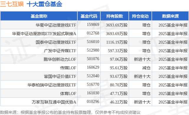 根据2025基金半年报公募基金重仓股数据,重仓该股的公募基金共31家,其中持有数量最多的公募基金为华夏基金的华夏中证动漫游戏ETF。华夏中证动漫游戏ETF目前规模为70.73亿元,最新净值1.6755(9月25日),较上一交易日上涨1.98%,近一年上涨110.36%。该公募基金现任基金经理为鲁亚运。鲁亚运在任的基金产品包括:华夏创业板成长ETF联接A,管理时间为2022年6月10日至今,期间收益率为-0.66%;华夏中证全指证券公司ETF联接A,管理时间为2022年6月10日至今,期间收益率为31.74%;华夏国证疫苗与生物科技指数发起A,管理时间为2022年9月6日至今,期间收益率为-26.18%;华夏战略新兴成指ETF联接A,管理时间为2023年3月27日至今,期间收益率为31.56%。