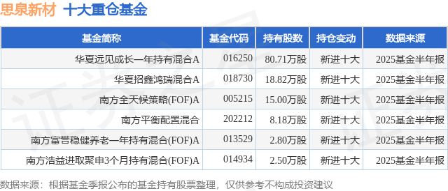 根据2025基金半年报公募基金重仓股数据,重仓该股的公募基金共6家,其中持有数量最多的公募基金为华夏基金的华夏远见成长一年持有混合A。华夏远见成长一年持有混合A目前规模为6.22亿元,最新净值1.3576(9月25日),较上一交易日下跌0.26%,近一年上涨108.54%。该公募基金现任基金经理为钟帅。钟帅在任的基金产品包括:华夏行业景气混合,管理时间为2020年7月28日至今,期间收益率为188.75%;华夏招鑫鸿瑞混合A,管理时间为2024年1月16日至今,期间收益率为109.36%;华夏卓越成长混合A,管理时间为2025年8月12日至今,期间收益率为16.39%。