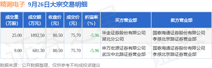 证券之星消息,9月26日精测电子发生大宗交易,交易数据如下: