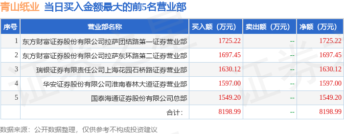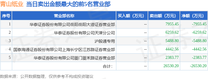 证券之星消息,沪深交易所2025年9月26日公布的交易公开信息显示,青山纸业(600103)因有价格涨跌幅限制的日收盘价格跌幅偏离值达到7%的前五只证券登上龙虎榜。此次是近5个交易日内第5次上榜。