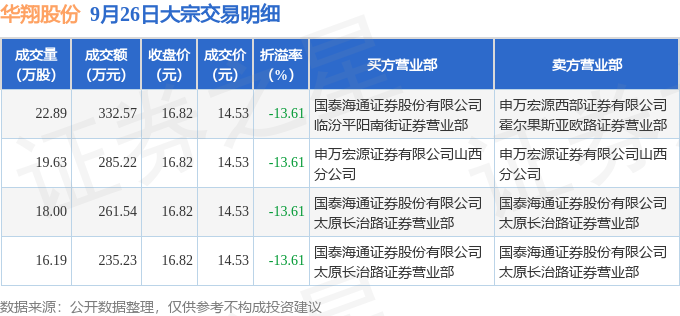 证券之星消息,9月26日华翔股份发生大宗交易,交易数据如下: