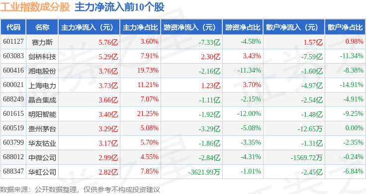 资金流向方面,工业指数(000004)成份股当日主力资金净流出合计264.62亿元,游资资金净流入合计67.92亿元,散户资金净流入合计196.7亿元。成份股资金流向详情见下表: