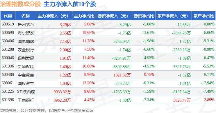资金流向方面,治理指数(000019)成份股当日主力资金净流出合计36.33亿元,游资资金净流入合计7.17亿元,散户资金净流入合计29.15亿元。成份股资金流向详情见下表: