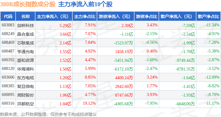 资金流向方面,380R成长(000119)指数成份股当日主力资金净流出合计62.57亿元,游资资金净流入合计16.2亿元,散户资金净流入合计46.37亿元。成份股资金流向详情见下表: